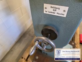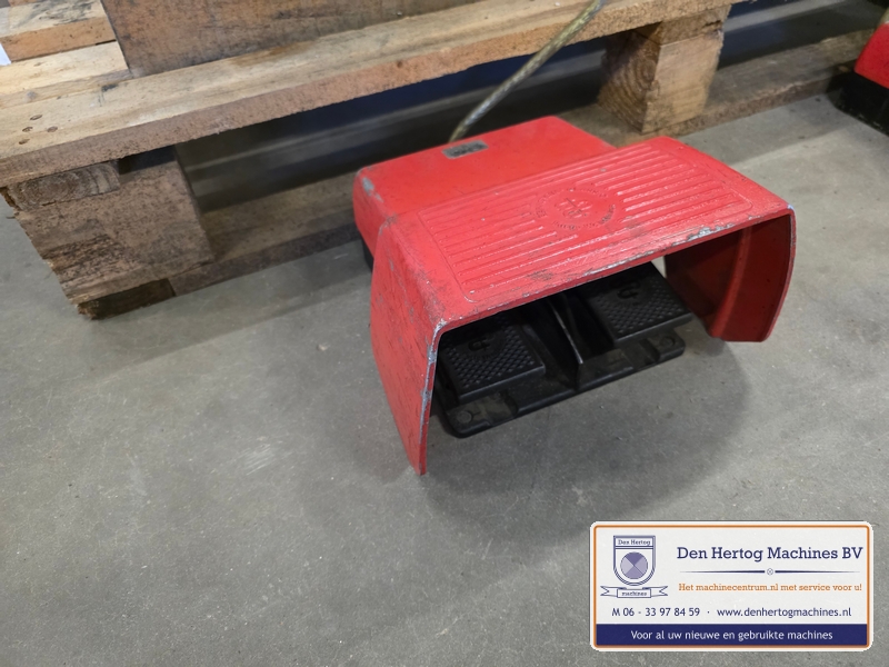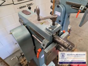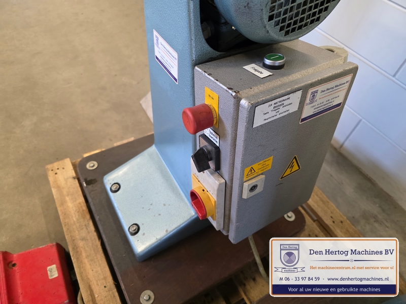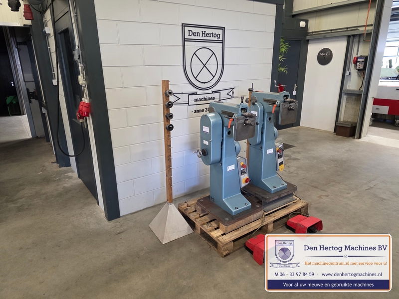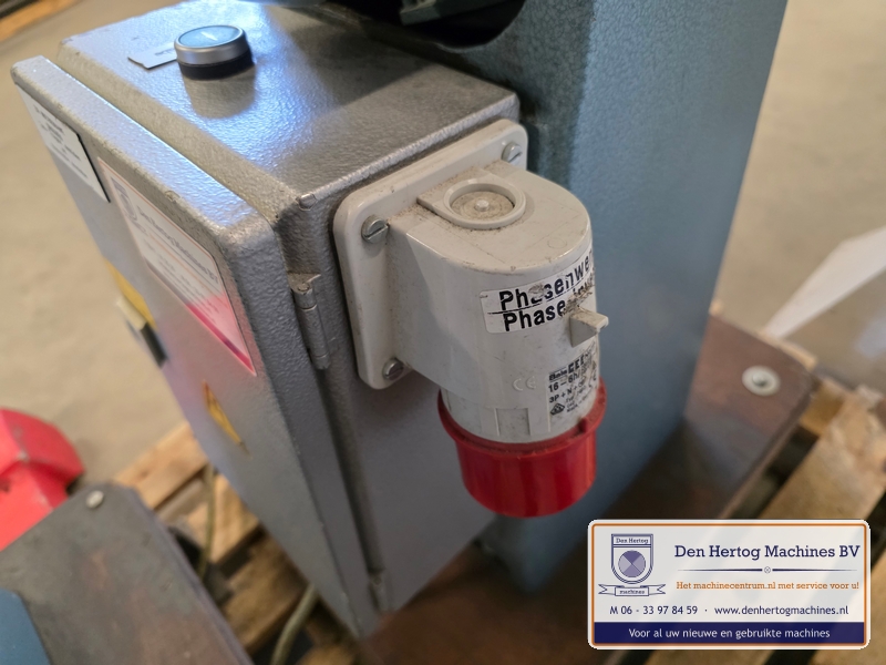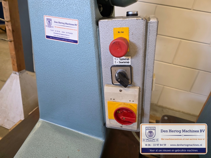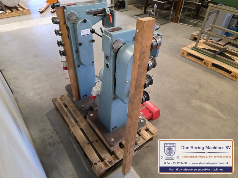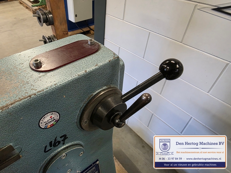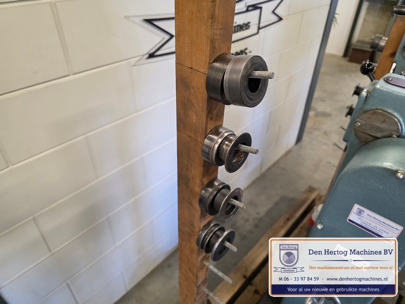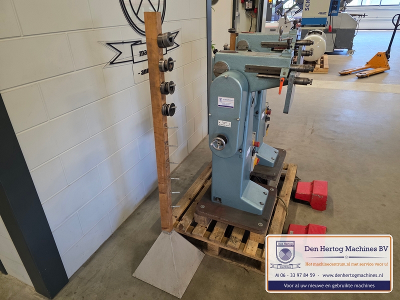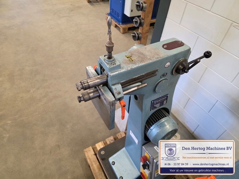 | Het machinehuis is gemaakt van gietijzer. De assen zijn gelagerd in onderhoudsvrije lagers. Geringe afmetingen doordat de aandrijfmotor in het frame is ingebouwd. Een grote aanslagplaat met een gehard voorzetstuk wordt meegeleverd. Axiale verstelling: bovenas d.m.v.excentriek Hoogte verstelling bovenas: d.m.v. handslinger (SMA56) en handwiel Aandrijving: elektrisch d.m.v. motor via een tandriemoverbrenging waardoor traploos snelheden gekozen kunnen worden. Type: SMA56 Capaciteit: 1,5mm bij 400N/mm2 Maximale werkdiepte: 260 mm Hartafstand rollen: 56mm Snelheden: traploos instelbaar Voeding: 400 Volt / 50 Hz / 3 fasen+randaarde Gewicht: 115kg Standaard: - Voetstuk - Voetpedaal met tip bediening en continue aandrijving - krachtstroom motor - Sleutel bevestiging voorrollen - Grotere aanslagplaat met gehard voorzetstuk |